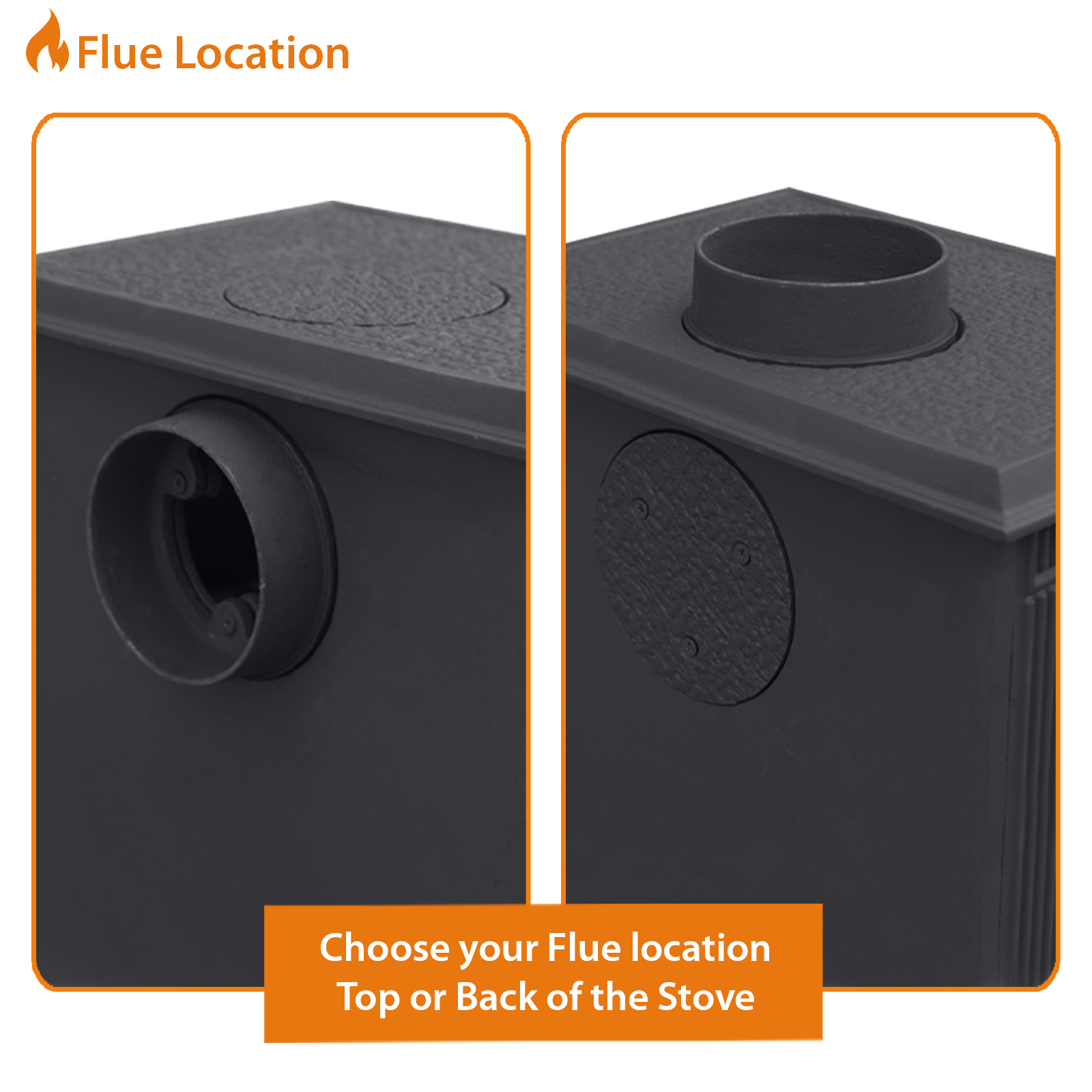 Crafted from solid cast iron and finished with brass handles, this durable log burner combines traditional looks with practical features. It includes a removable ash pan for easy maintenance and offers a flexible flue outlet, with the option to position it at the top or rear of the stove.