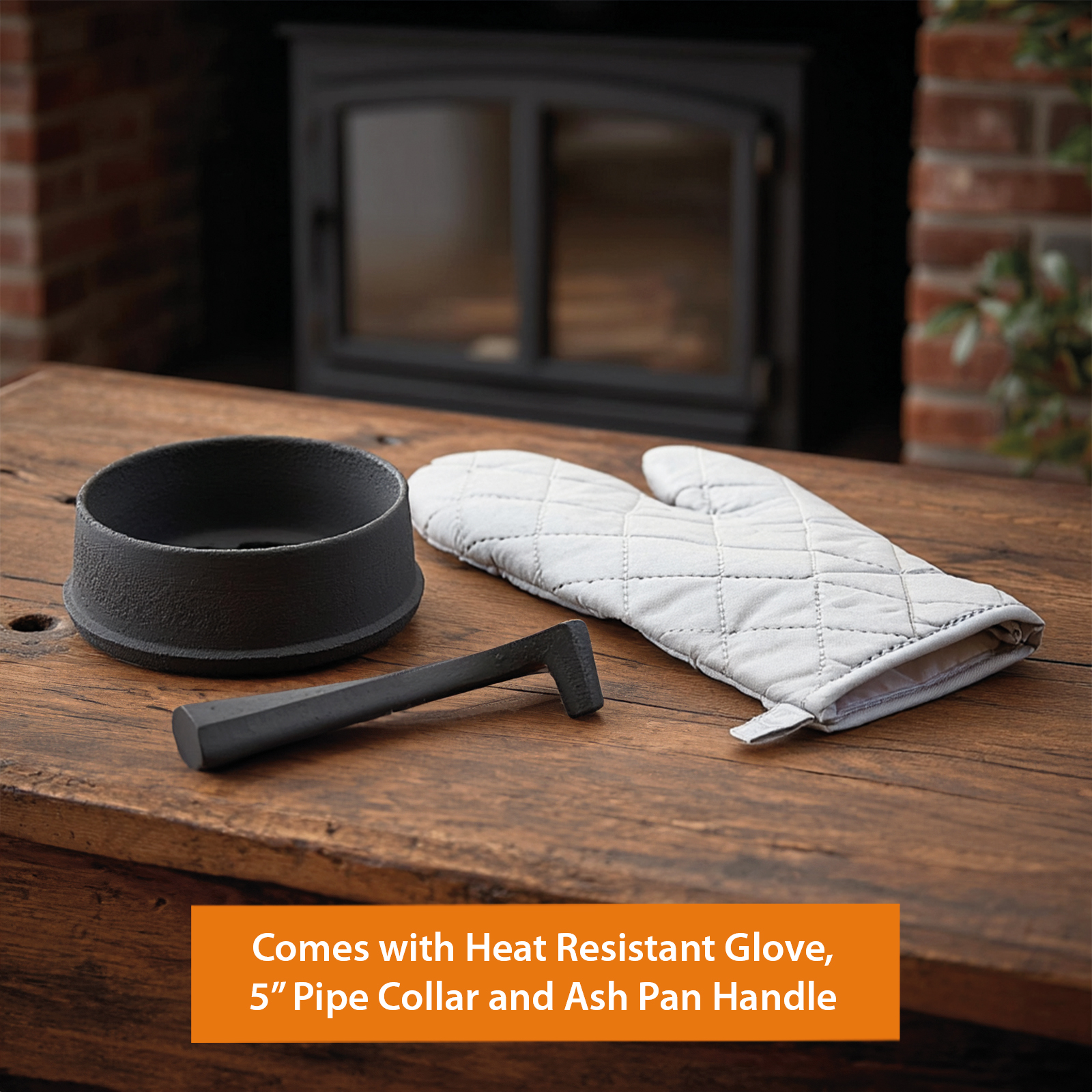 Includes: Baffle Plate, 5″ Pipe Collar, Ash Pan Handle, 1 x Fire Resistant Glove